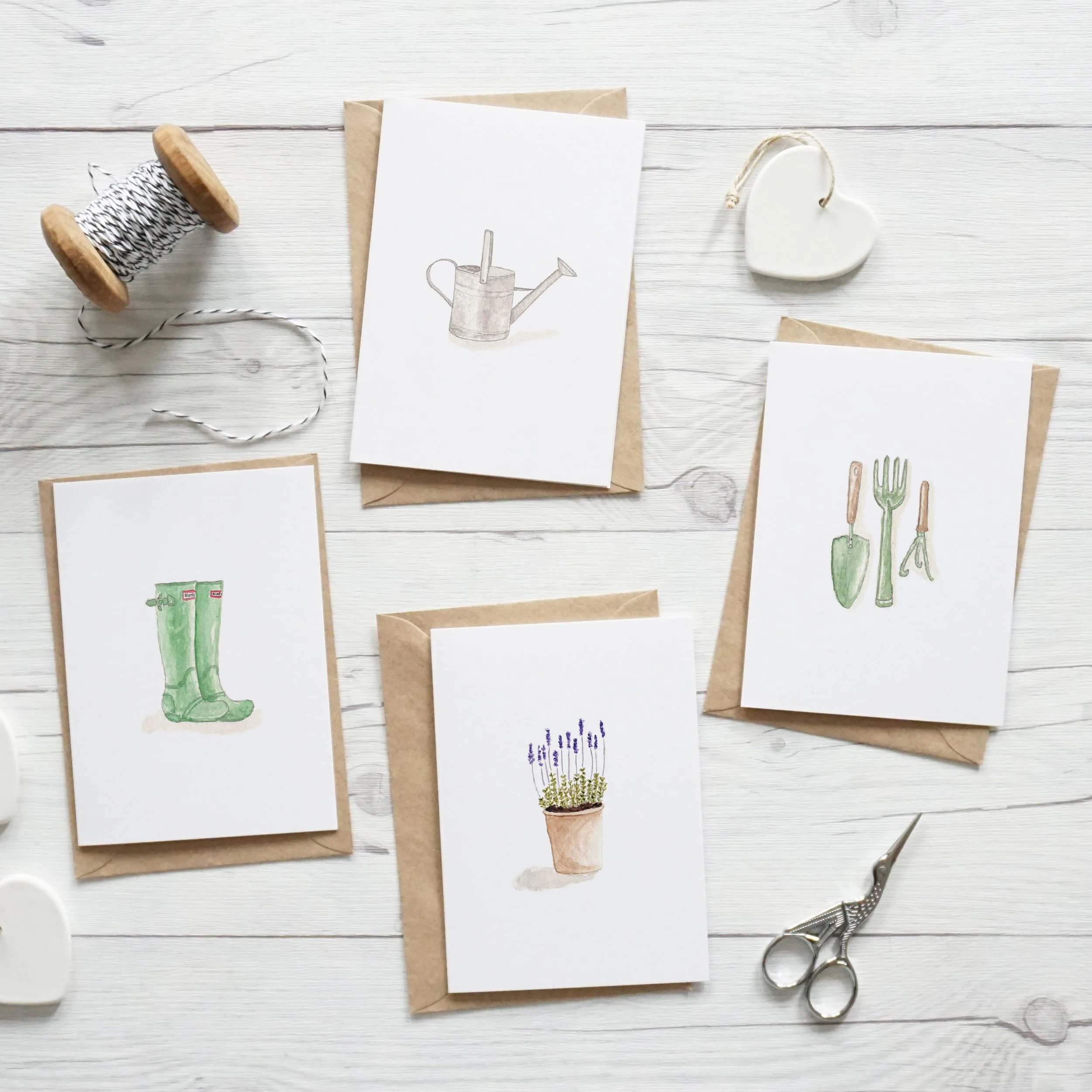 A charming set of watercolor notecards inspired by everyday moments in the garden. This botanical stationery set includes four original illustrations: a lavender pot, garden tools, wellie boots, and a classic watering can.